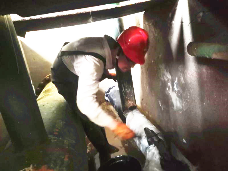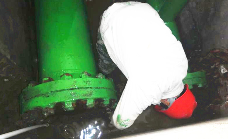 原鹵管線是采鹵崗位重要的組成部分,是停車必檢項之一。但是檢修難度不小,一是過道空間狹小,光線昏暗,一次僅夠兩個人同時作業(yè);二是檢修原鹵管線時,必須“涉水”作業(yè)。檢修期間原鹵管線一閃一閃的焊光將周圍照亮,順著火花向里看去,只見有兩個人在狹小的空間綣著身子低頭忙活著,感覺身子都轉(zhuǎn)不開的樣子。他們像小貓似的蜷縮在兩邊,全身濕透,白色的工服也被銹漬染的亂起八糟,被油漬沁透成一坨一坨的,但他們堅定的眼神、專注的神情卻叫人佩服。我不禁問道:“這么窄的空間人咋進去啊?”他們開玩笑的說:“用縮骨功啊!”