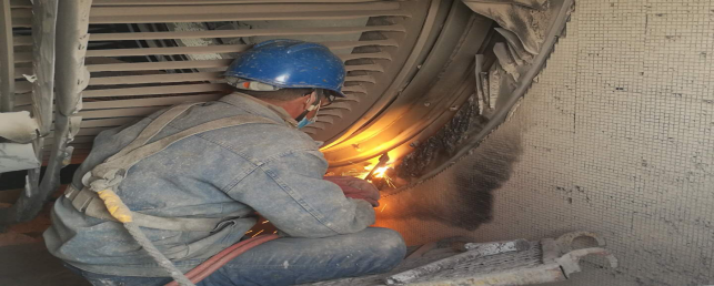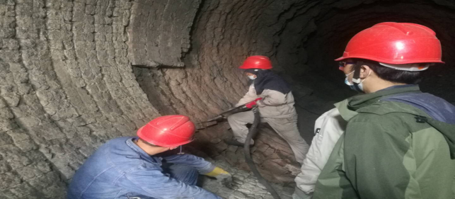 在回轉窯,做好更換窯磚前期準備工作——清理深挖4米處窯皮、窯磚。