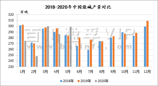 量上面,2020年1-5月中國液體燒堿共出口13.8萬噸,相比于2019年1-5月出口量18.8萬噸,下滑26.6%;
