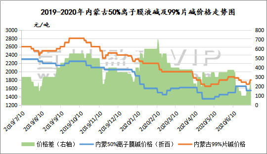 如上圖,可以明顯看出,從2019年至今,99%片堿與50%離子膜液堿折百價(jià)格差有不斷縮減趨勢,這意味著片堿行業(yè)利潤下滑,2020年上半年中國片堿市場價(jià)格大幅下滑,跌落至近十年的歷史低位。