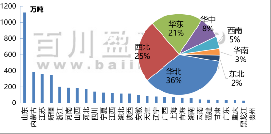 產(chǎn)能:增產(chǎn)集中地為江蘇、內(nèi)蒙古、山東、河北、新疆地區(qū),預(yù)計(jì)到2023年,中國燒堿產(chǎn)能約4600-4700萬噸,山東省燒堿產(chǎn)能將逼近1300萬噸,新疆維吾爾自治區(qū)燒堿產(chǎn)能有望突破400萬噸,江蘇、內(nèi)蒙古及新疆三地?zé)龎A生產(chǎn)能力旗鼓相當(dāng)。