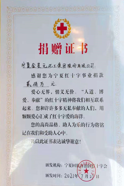 洪災無情,人間有愛。7月28日,寧夏金昱元化工集團股份有限公司委托寧夏紅十字會向河南災區捐助二百萬元,馳援河南受災地區,表達對災區人民的深切問候。